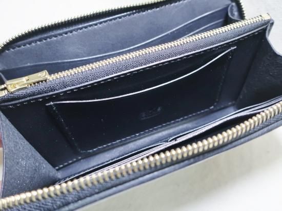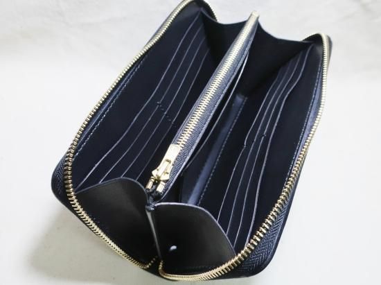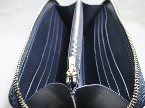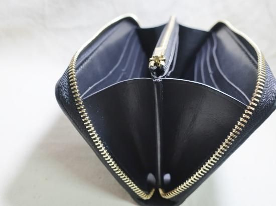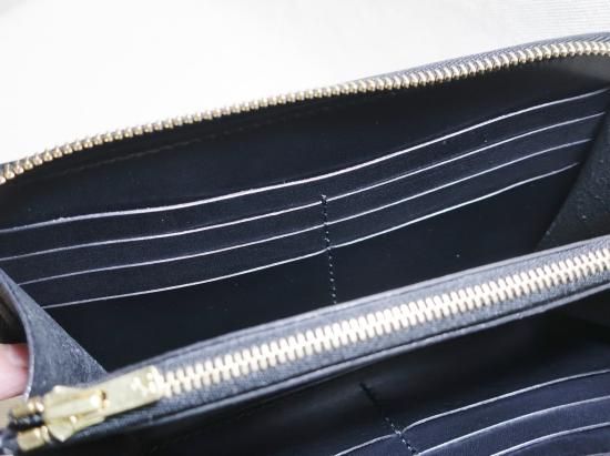 内側は、サドルレザーを使用し小銭x1、札入れx2、カード入れx12と収納スペースを多く設け、カードやお札、レシート等を選別して収納出来、使用し易さ、使い勝手も良く、素材全ての良さが現れ、オーダーならではの構造のラウンドジップウォレットに完成しました。