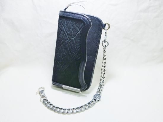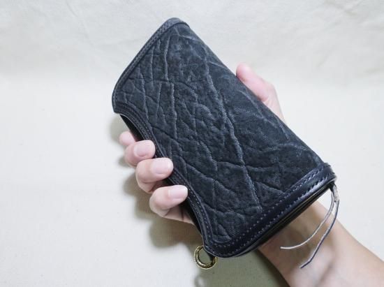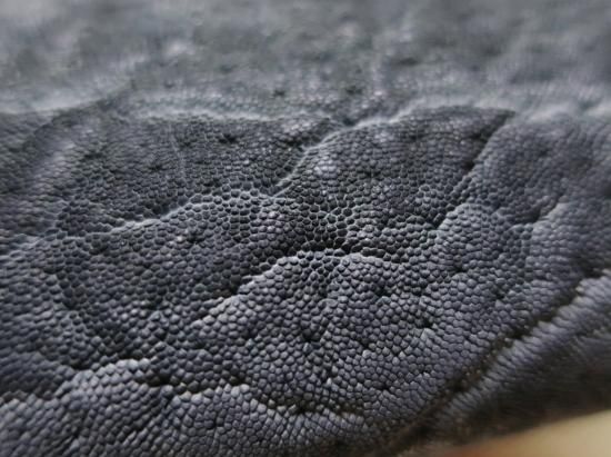 ゾウ革の特徴は、厚く丈夫で特有の大きなヒダ、シワがあり、細かい粒状が特徴で、