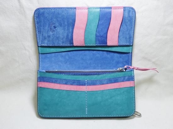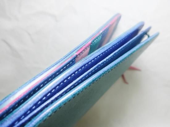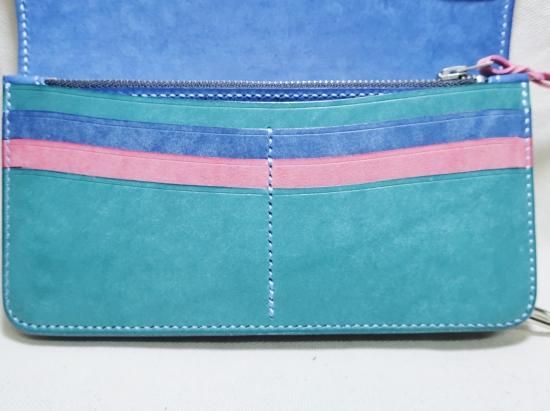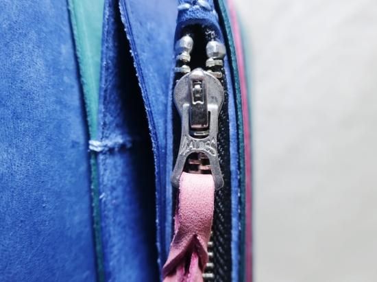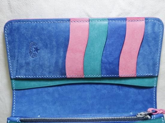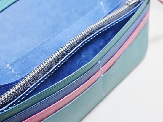 内側/ショルダーレザー・ブルー、ターキーブルー、ピンクのコンビ。