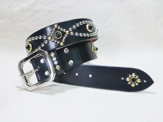 スタッズとラインストーンを肉厚のサドルレザーに、