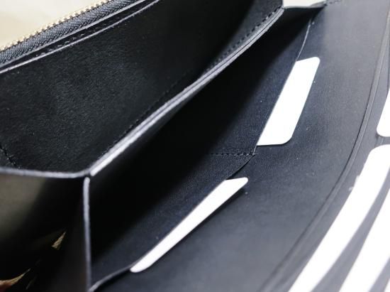内側は、サドルレザーとゾウ革の色合いがとても良く、又、丸みを付けたデザインで、取り出し易く、又、小銭x1、札入れx3、カード入れx12(札入れの間x2)、札入れの後ろに2か所と豊富な収納スペースで、カードやお札、レシート等を選別して収納出来ます。