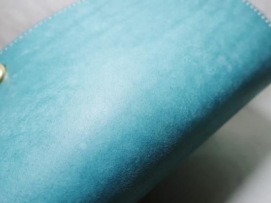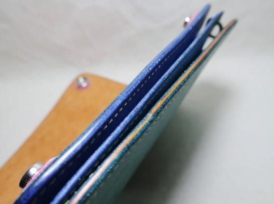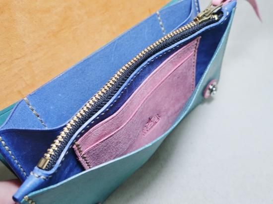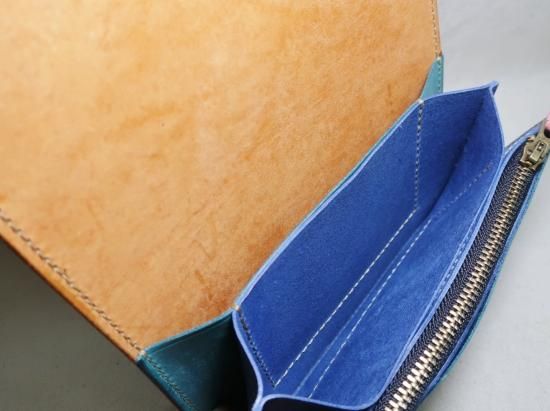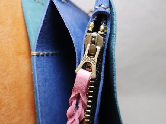 内側/ショルダーレザー・ブルー、オレンジ、ターキーブルー、ピンクのコンビ。