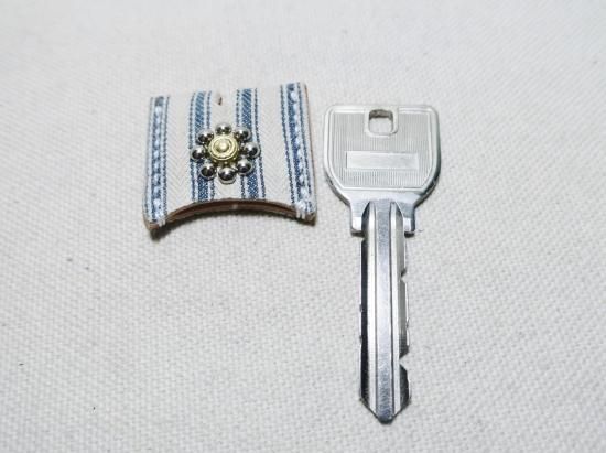 スタッズキーカバー/アンティーク生地/鍵カバー/ティッキング生地/ハンドクラフト/1900年代/革小物/手縫い/レザークラフト/キーカバー