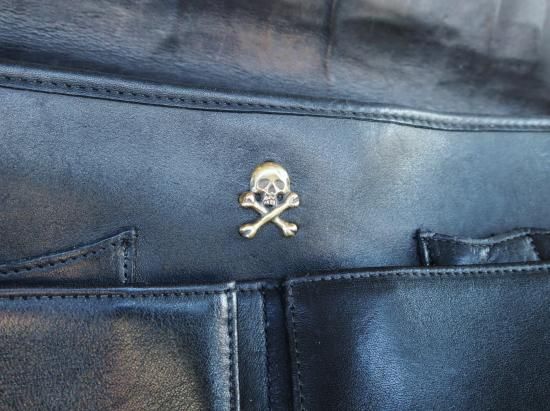 ショルダー部分にサル革を付け、フラップを開けた所にスカルクロスボーンの真鍮をセット。