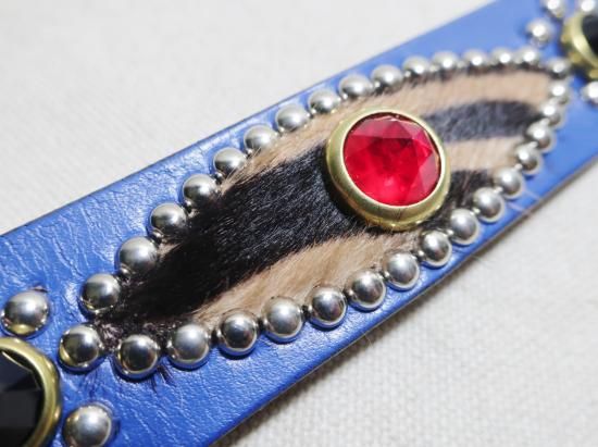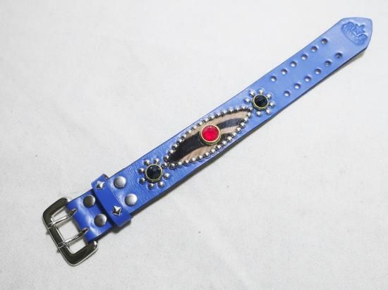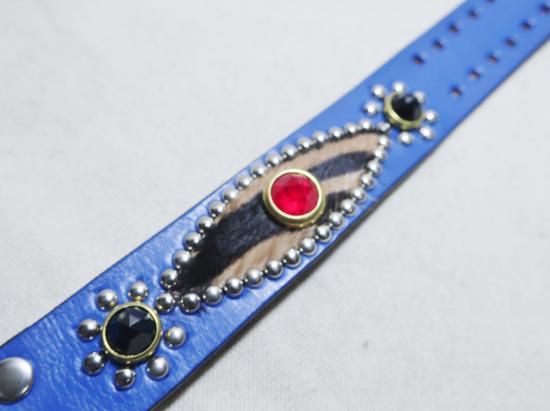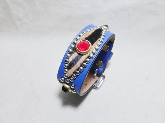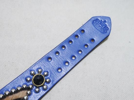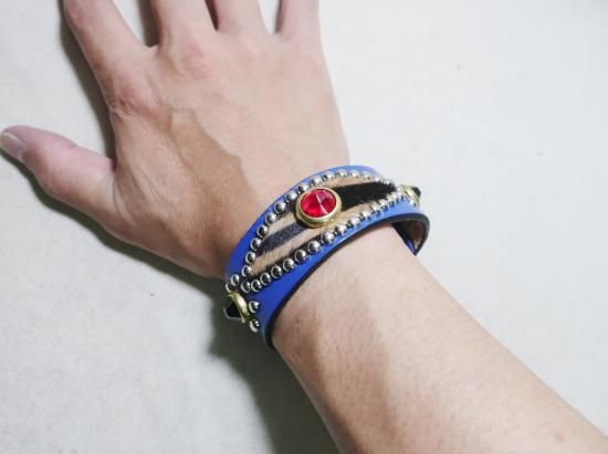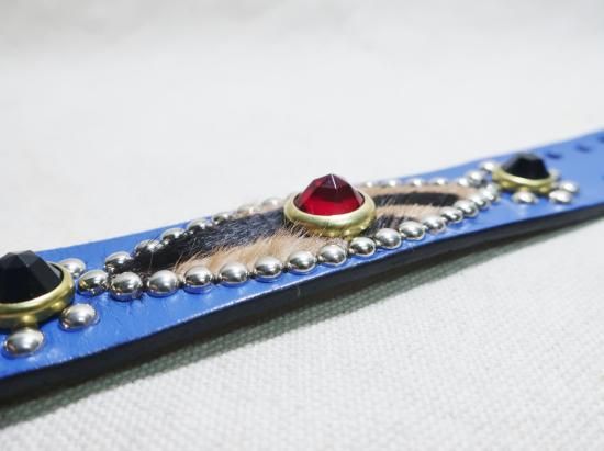 サドルレザーに、ヘアカーフをインレイ使用したスタッズブレスレット。