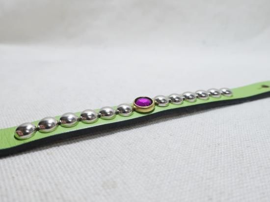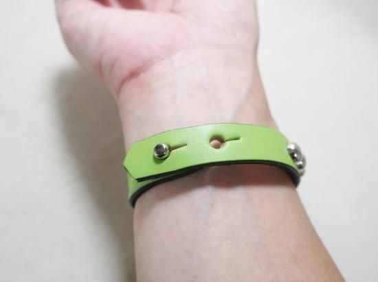 1.3cm幅ですので手首の圧迫感も無く、腕時計やシルバーバングル等されている方でも、重ね付けに。2つのホールが御座いますので、男性には18.5cm、女性は16.5cmで合せて欲しいブレスレットです。