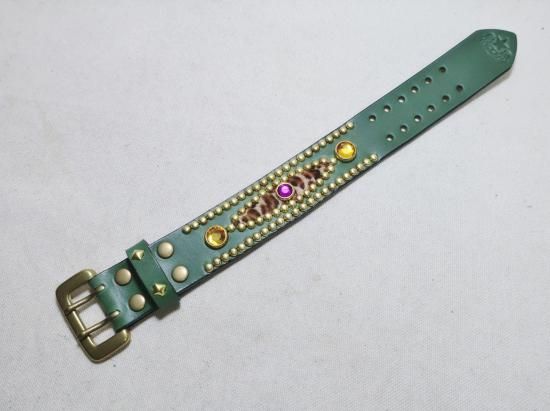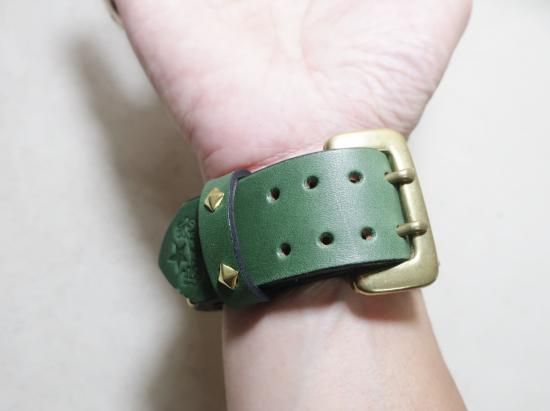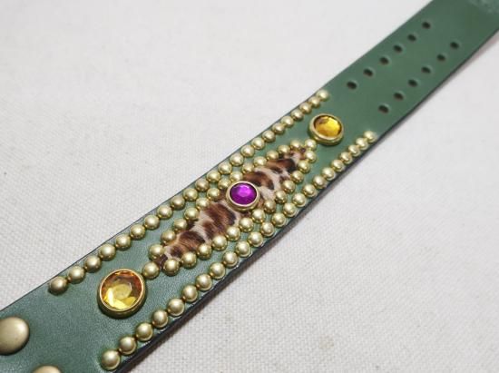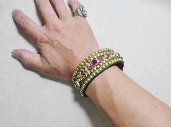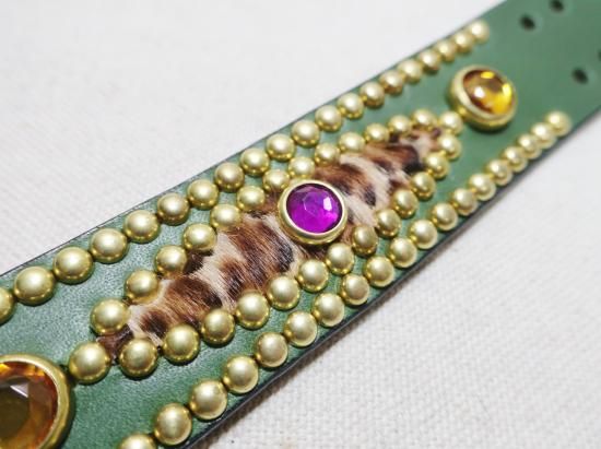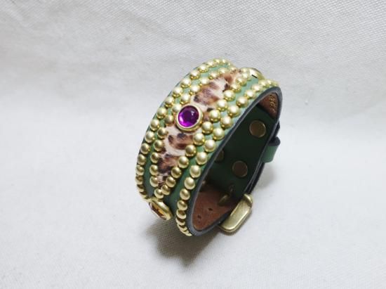 サドルレザーに、レオパード(ハラコ革)をインレイに使用したスタッズブレスレット。